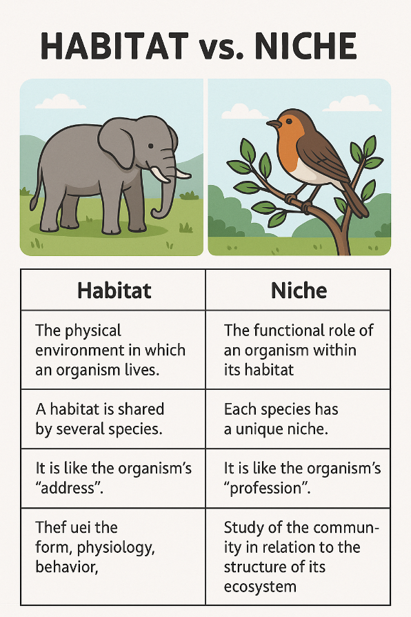 - Each species has a unique niche, even if they share the same habitat. No two species in the same habitat can occupy identical niches for long. If that happens, they will compete directly with each other, and eventually, one species will be eliminated or displaced due to competitive exclusion.