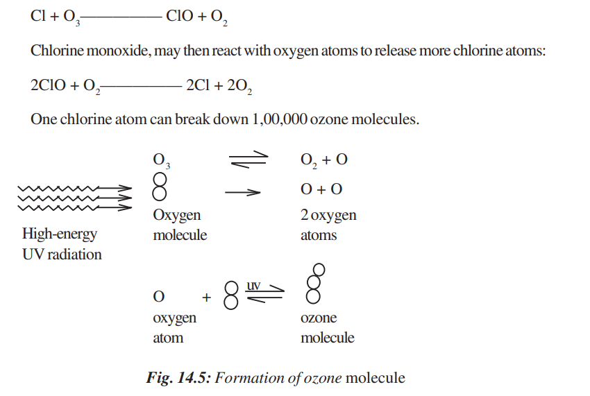 - Any event, which release chlorine atoms into the atmospheric, can cause severe ozone destruction, because chlorine atoms in the stratosphere can destroy ozone very efficiently. Most damaging among such agents are human made chlorofluorocarbons (CFCs), which is widely used as refrigerants and to pressurize sprays cans. In stratosphere, chlorine atoms from CFCs react with ozone to form chlorine monoxide and oxygen molecule.