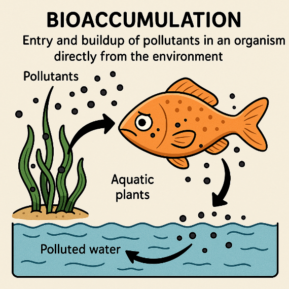 Bioaccumulation refers to the entry and buildup of pollutants in an organism directly from the environment. |