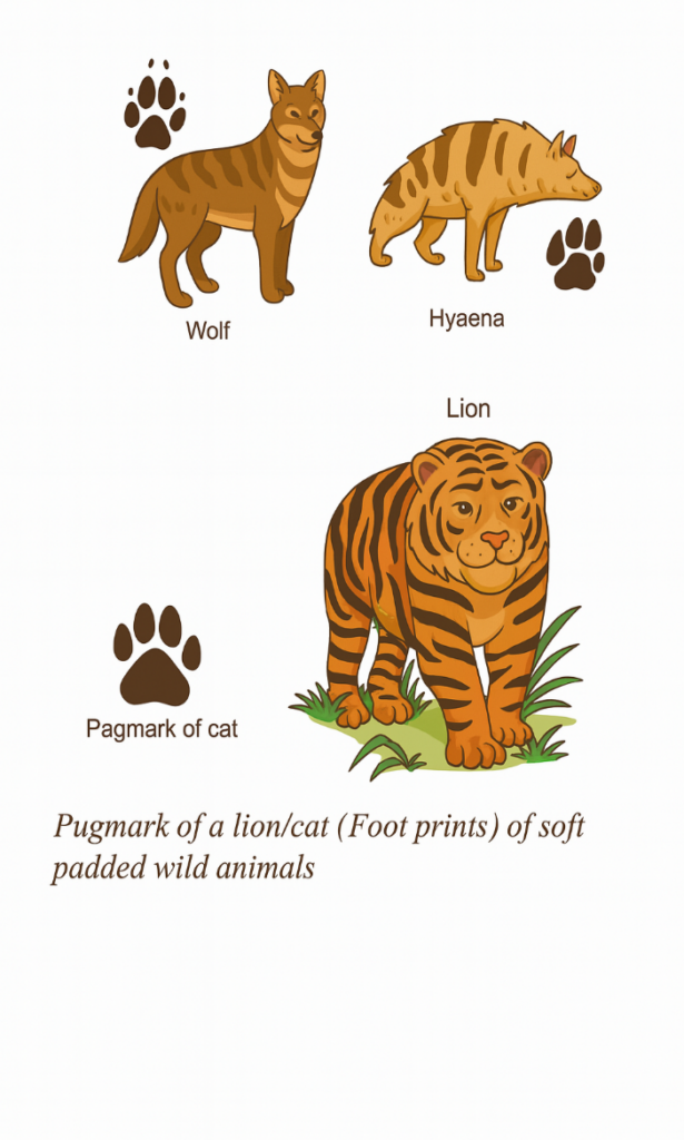 - Pugmarks are unique to each individual and can provide valuable information if interpreted carefully. They help in determining the presence of different species in the area, identifying individual animals, estimating the population of large cats, and assessing the sex ratio and age (young or adult) of these animals.