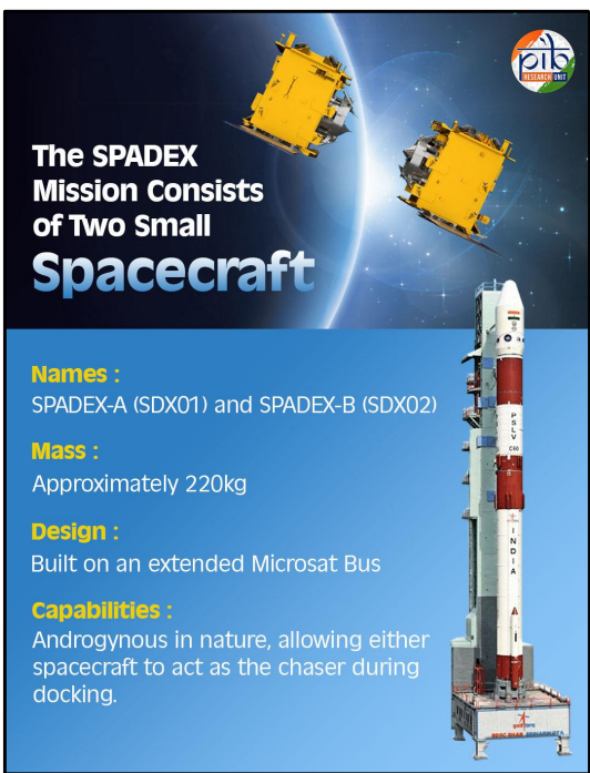 - SpaDeX is a cost-effective technology demonstrator mission designed to showcase in-space docking using two small spacecrafts launched by the 62nd PSLV flight. This mission is pivotal for India’s future space ambitions, including lunar missions, sample returns, and the development of the Bharatiya Antariksh Station (BAS).