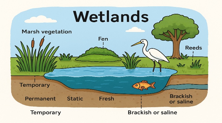Wetlands are areas intermediate between terrestrial and aquatic habitats, often transitional in nature, located between dry land and deep-water bodies. They experience periodic flooding and support unique flora and fauna adapted to waterlogged conditions.